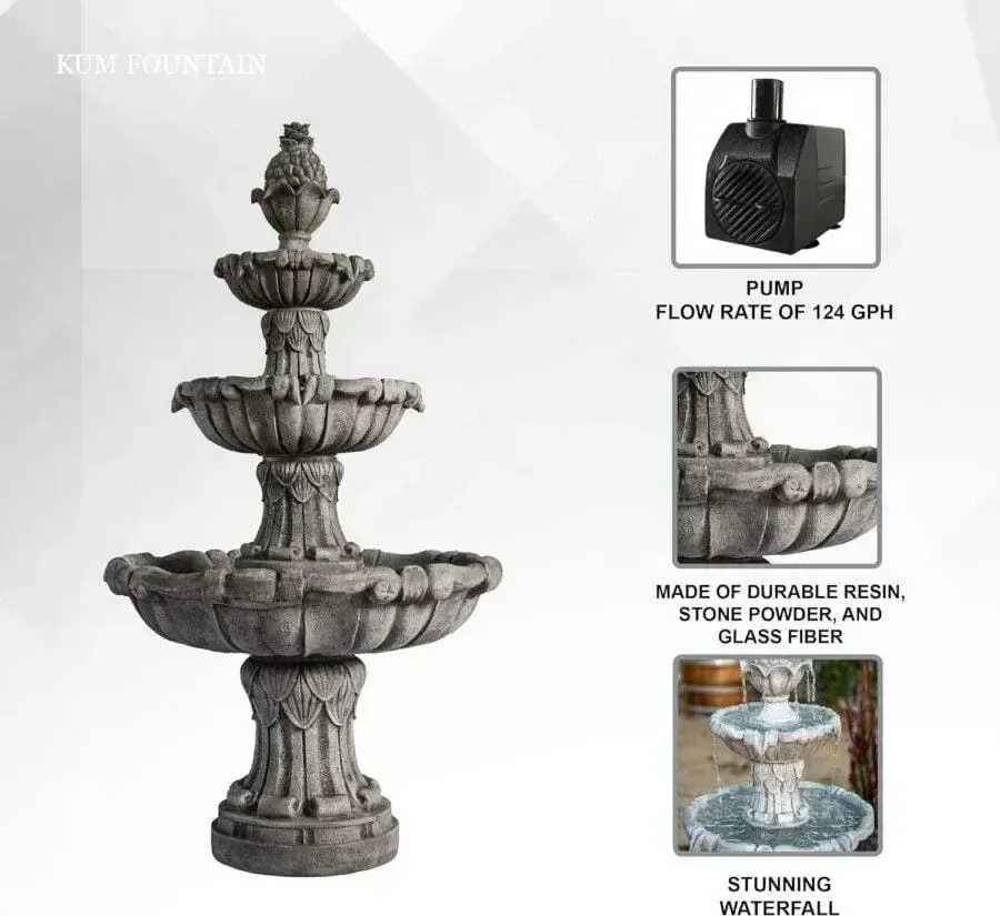 Đài phun nước cổ điển 3 tầng với dòng nước thư giãn và mềm mại: Thư giãn với âm thanh của vòi phun nước êm dịu và giải tỏa sự mệt mỏi sau một ngày mệt mỏi
